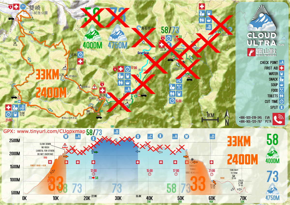 *please note START TIME changed 30min earlier to 3:30am. Cut times above are more friendly to runners. However we suggest consider well your strenght on intersection X where is possible drop distance to 58km instead of DNF later on course.