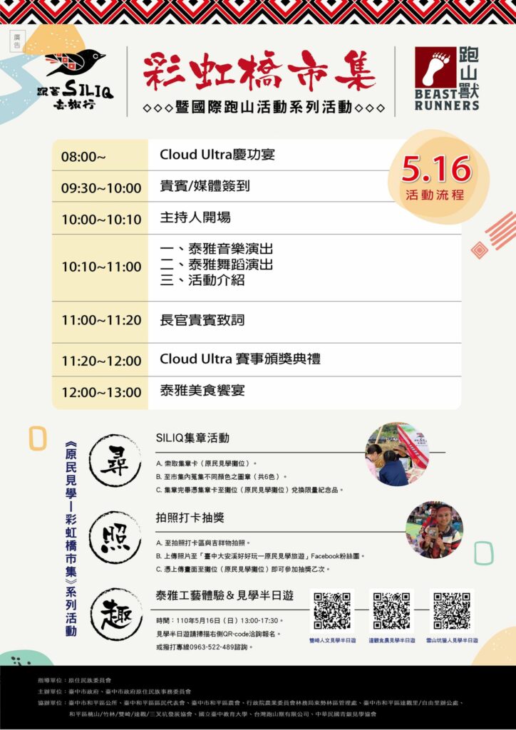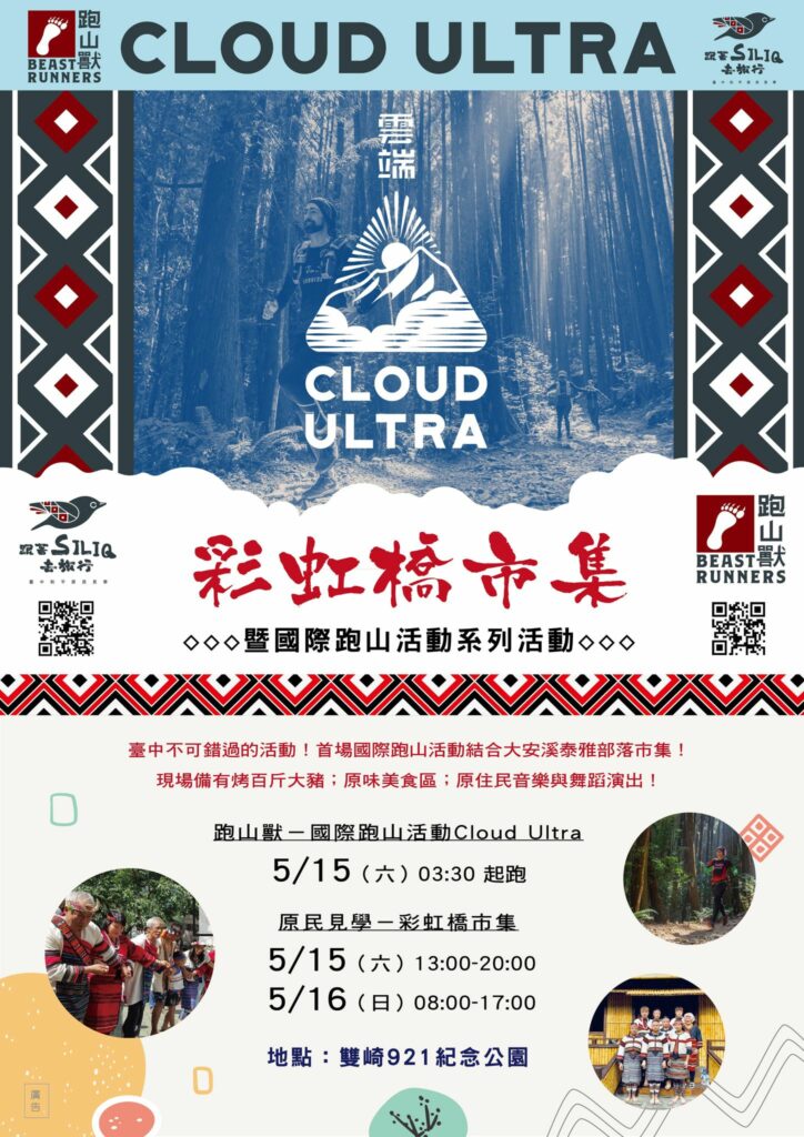 這從次Cloud Ultra是原民局,台中教育大學的推廣大安溪部落的計畫,一起結合跑山獸的越野跑山,活動期間5/14-5/16都有系列活動(如下),也貼上活動行程表,歡迎帶家裡的大小朋友一起來玩~ 謝謝~